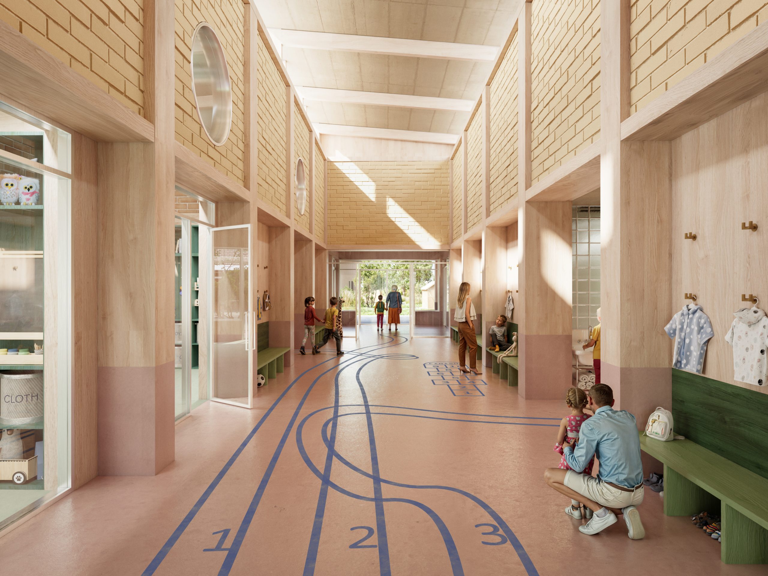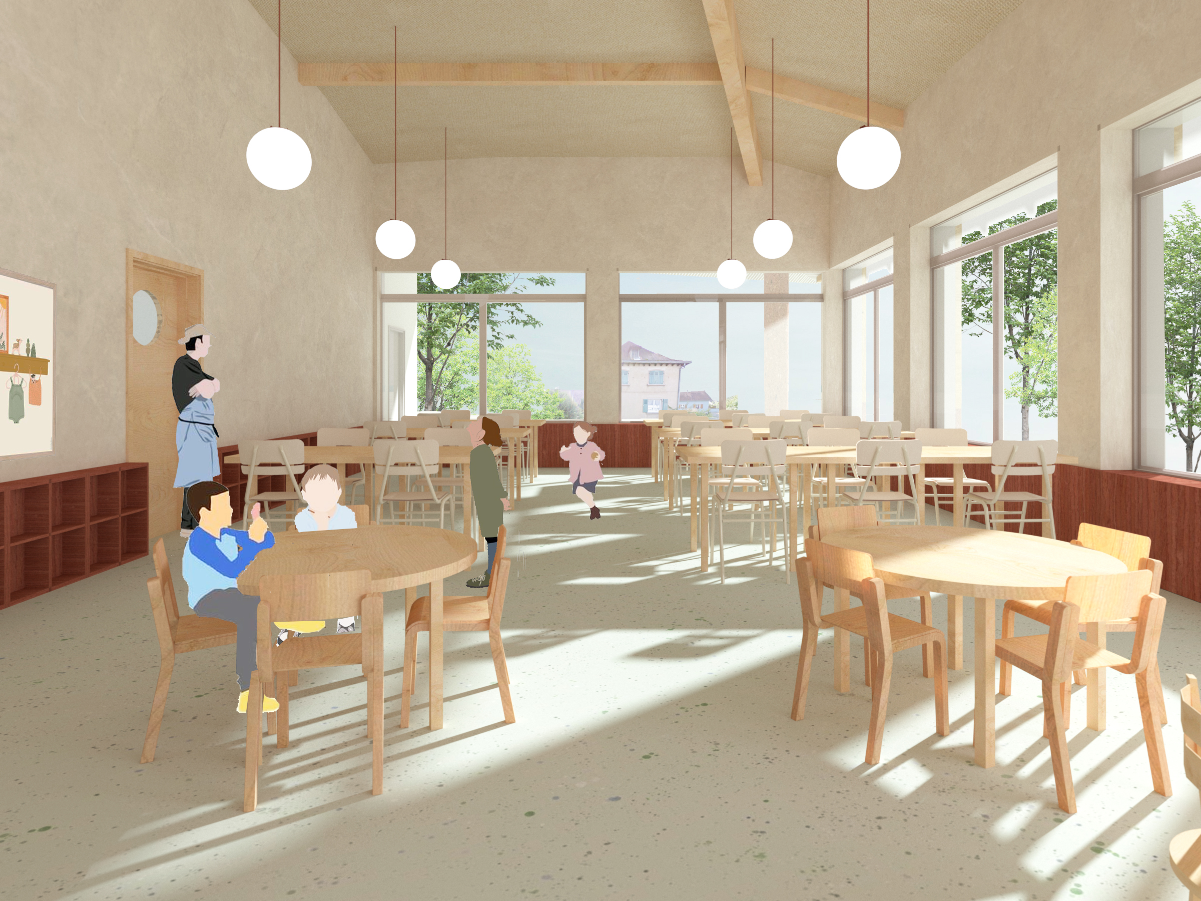 Pas question donc de se placer en rupture, ni même ‘à côté’. Le bâtiment proposé reprend le langage de l’école existante et les traits de ses voisins.
