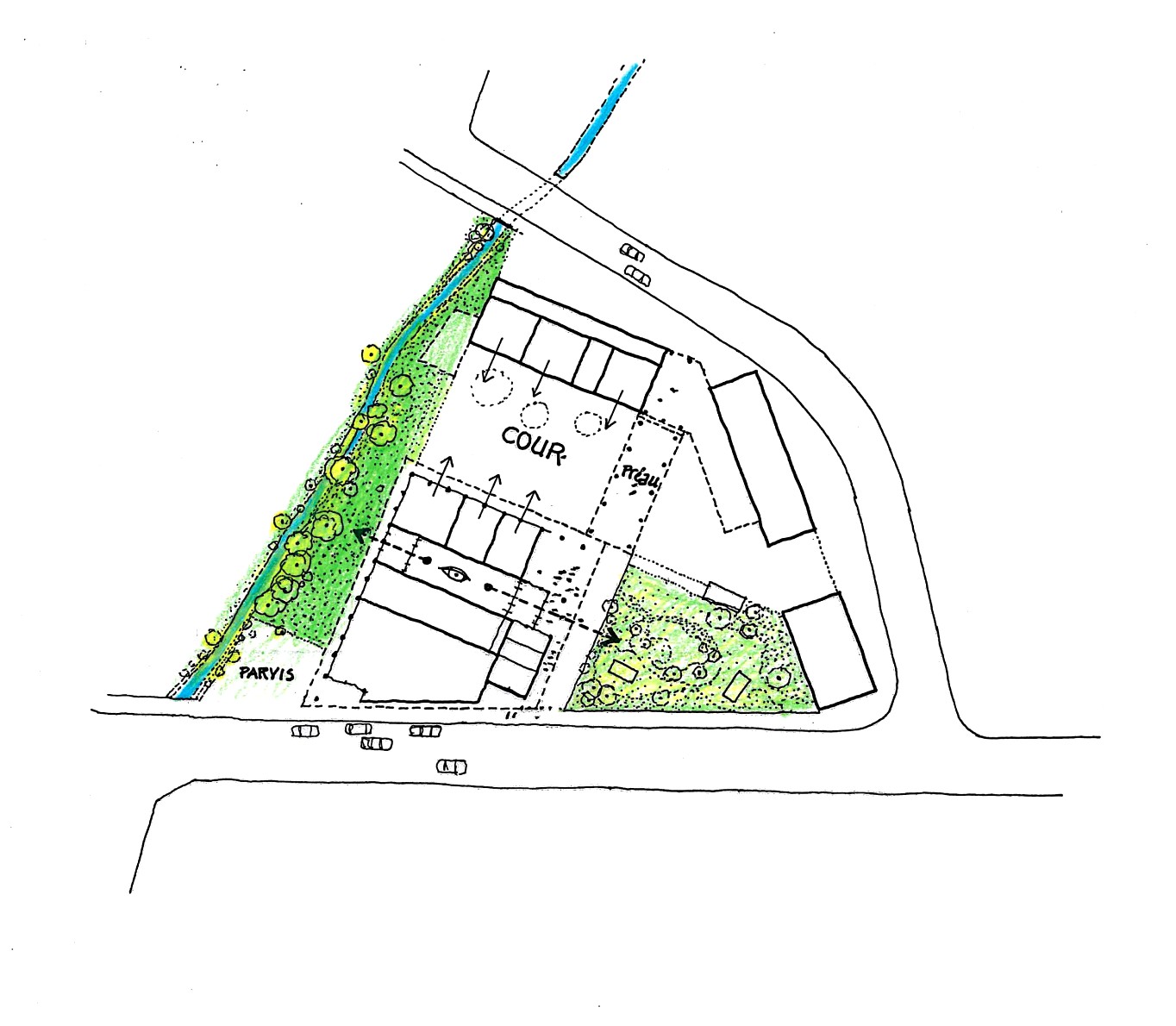 environnante. Cette dernière, élément familier et identifiable, couvre et protège le nouvel équipement, et est supportée par de larges poteaux maçonnés couleur grès. Le bâtiment s’implante le long de la rue de la Dordogne, pour recréer une intériorité au groupe scolaire ainsi créé, achevant de construire la continuité bâtie formant îlot entre les rues de la Dordogne et du Sel.