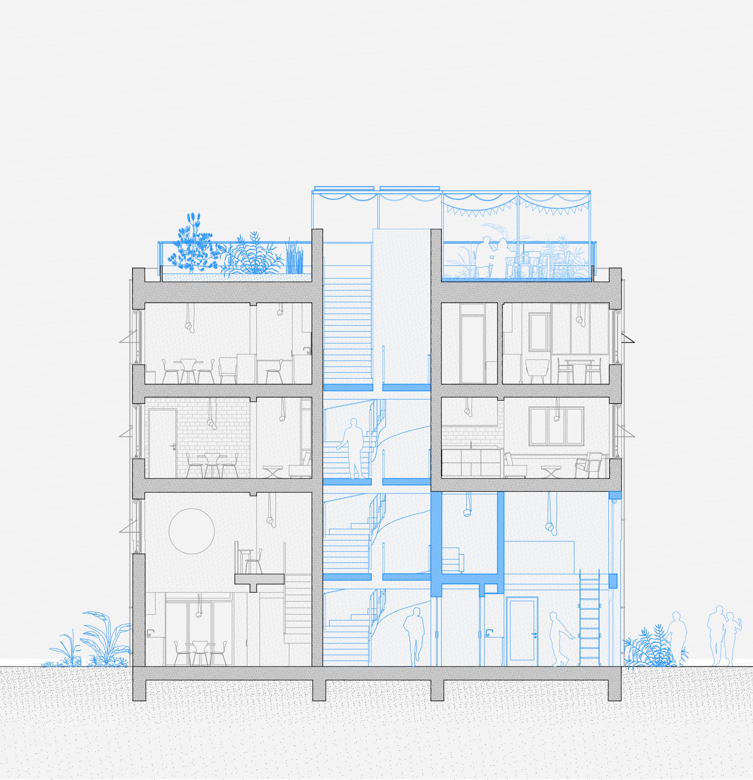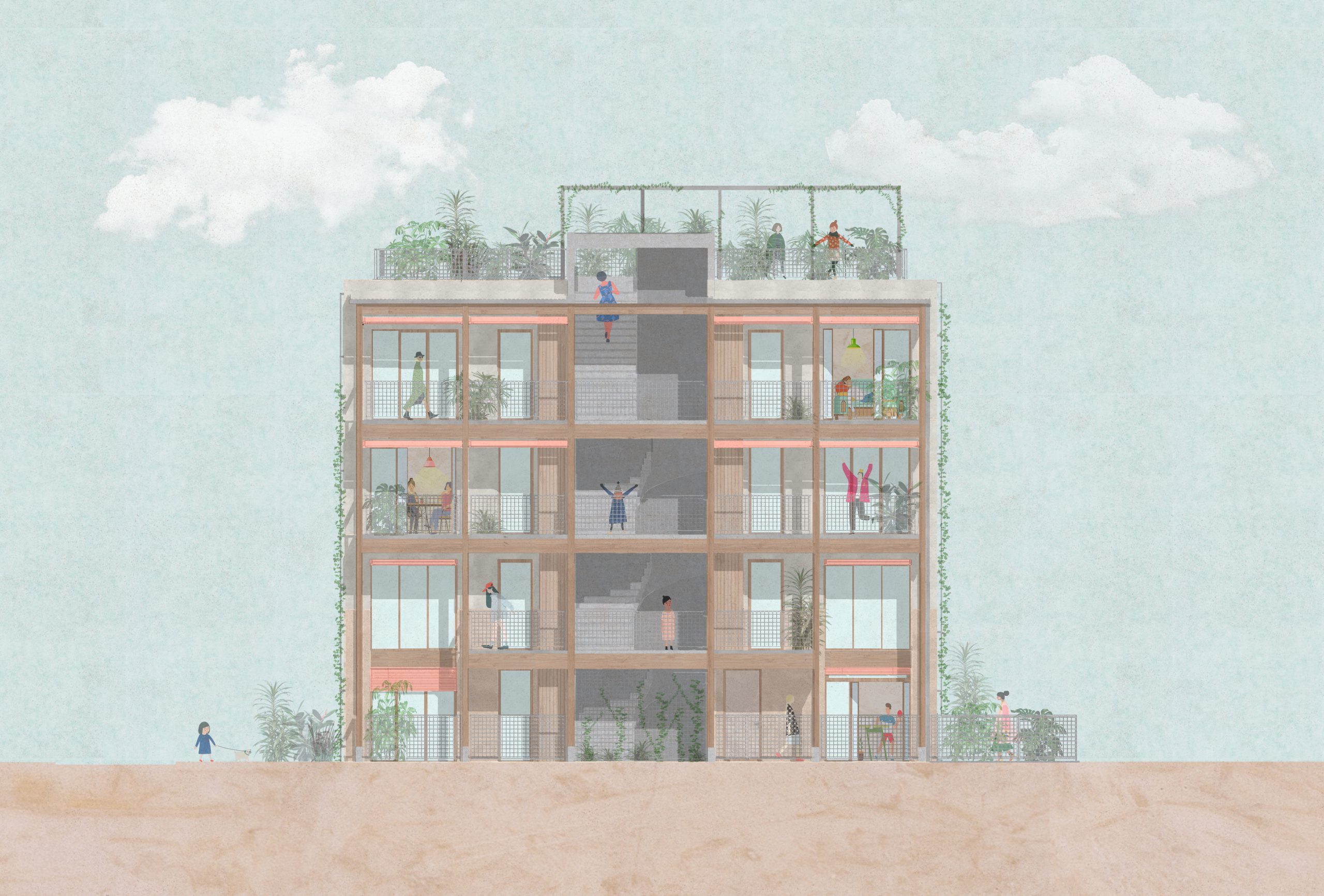 Projet de 5 logements en autopromotion à Strasbourg, sur la ZAC Citadelle piloté par la SPL des Deux-Rives. Logements en structure bois, isolations en matériaux biosourcés. Le projet s’organise autour de deux espaces de convivialité situés au rez-de-chaussée, bénéficiant d’une généreuse double hauteur, et d’une toiture terrasse végétalisée, connectés par un escalier couvert desservant également les balcons des logements créant une façade dynamique sur la rue.